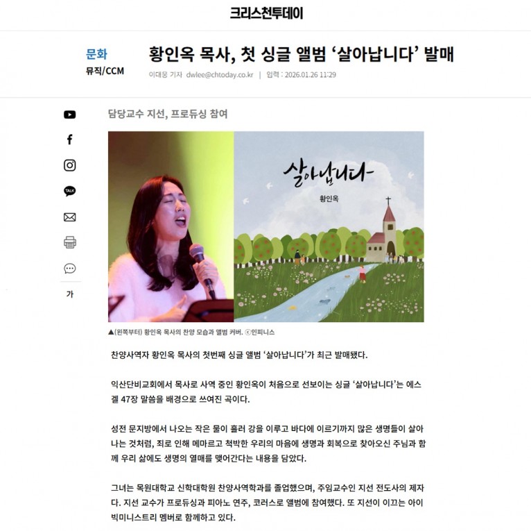 [기사] 황인옥 목사, 첫 싱글 앨범 ‘살아납니다’ 발매(크리스천투데이)